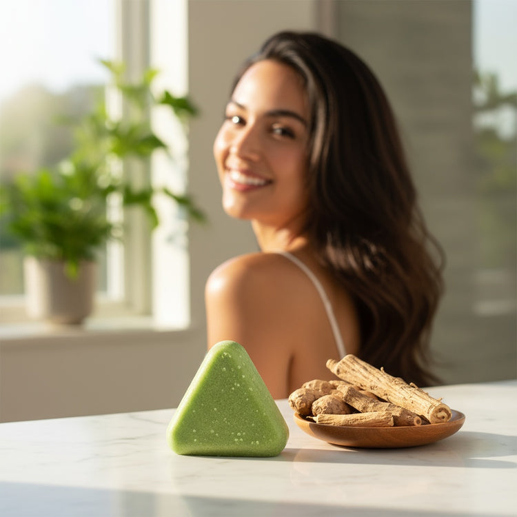 SEVEN GREEN™ shampoo bar is packed with biota orientalis and ginseng to strengthen follicles, control oil, and deliver a glossy shine—naturally free from sulfates, parabens, and silicones.